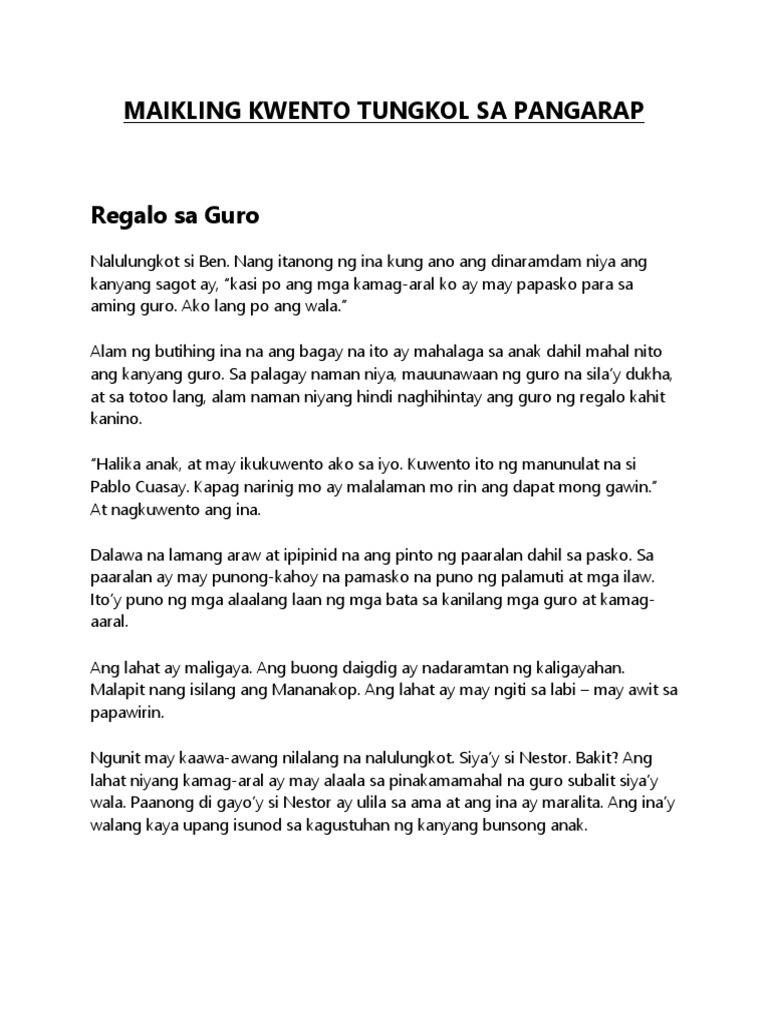 Sila rin ang madalas nating kasangga kung may problema tayong pinagdadaanan. Maikling Kwento Na May Aral. Dahil sa nangyari inuusig ng konsensiya ang ama.