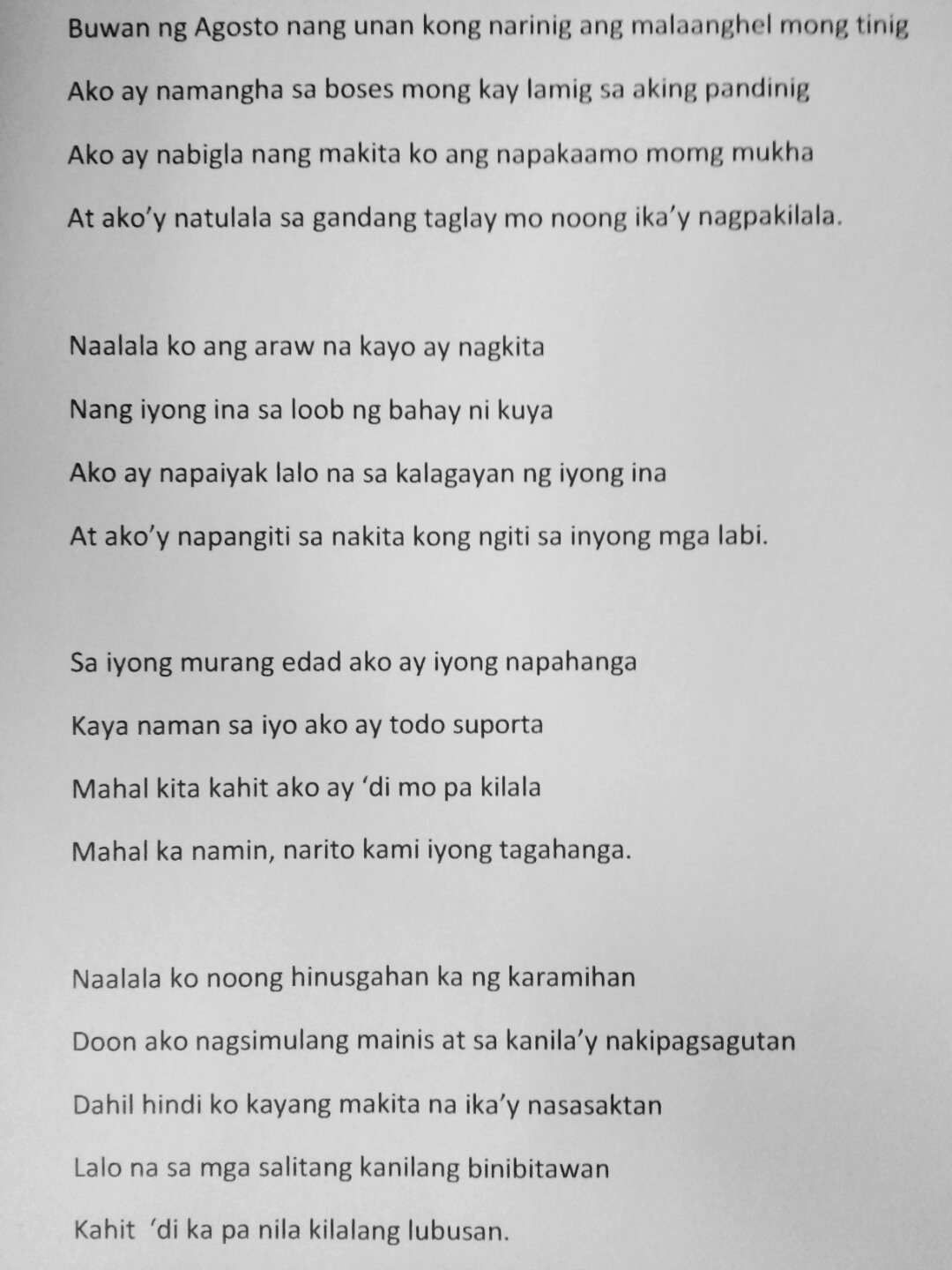 Sa kanya inutang ang mga lumipas Nang akoy musmos pat walang nilalandas. Pag-ibig na wagas totoot dakila. Sa mundong ito simula nang akoy mabuhay Ang mga magulang ko ang aking taga gabay.