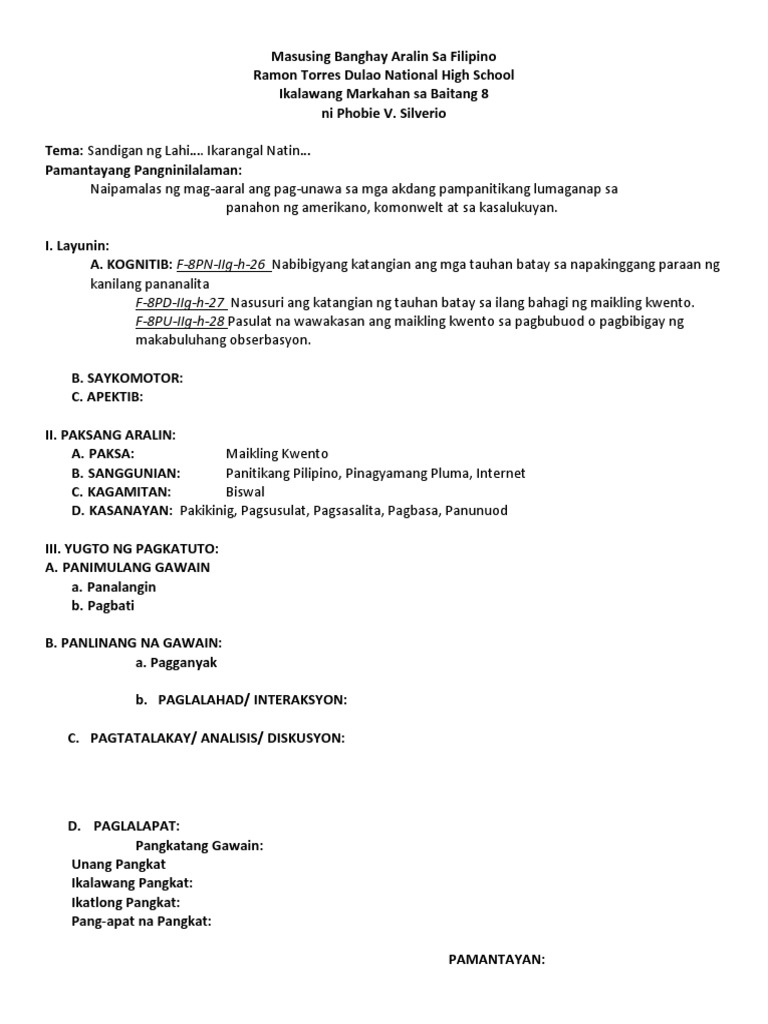 Mala masusing banghay aralin sa filipino 7. Detailed lesson plan in filipino. Basahin ang kabuuan ng maikling kwento tungkol kay Tikboy at sa dalawang duwende.