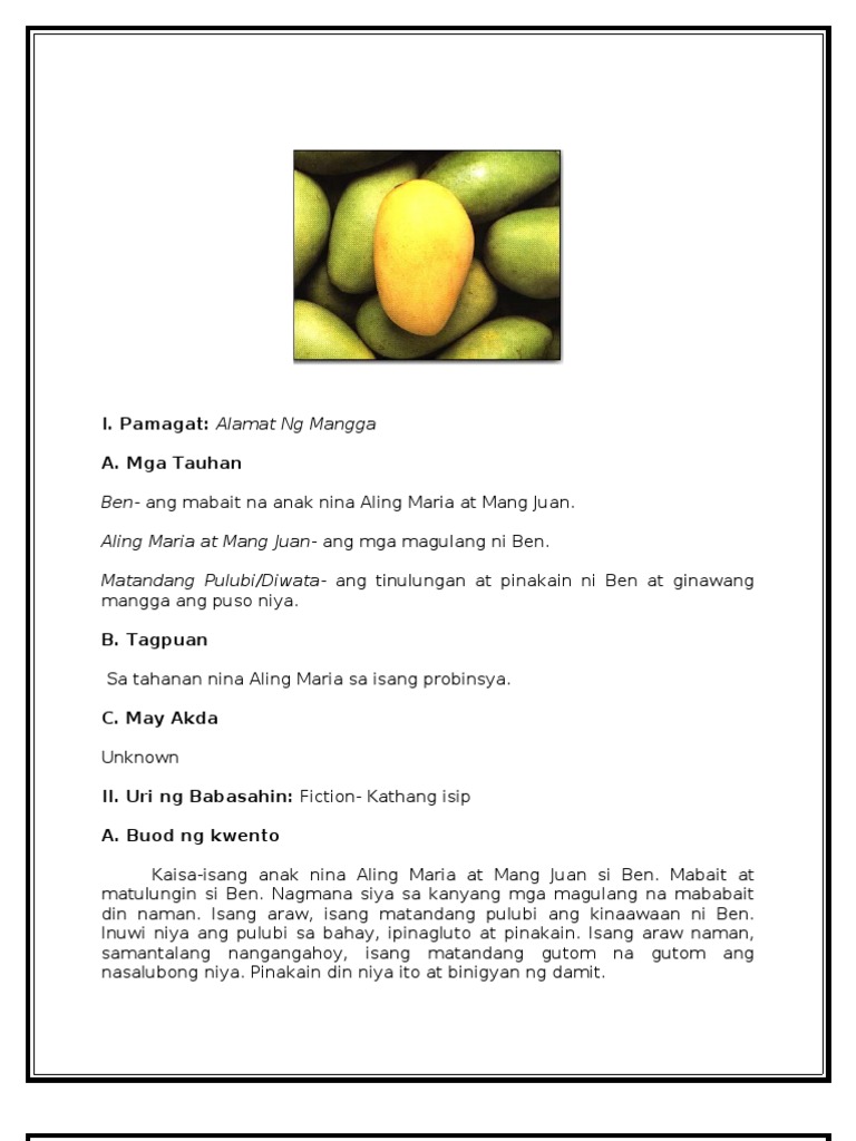 Masisipag ang mag-asawa ngunit ang. Buod ng Alamat ng Mangga. Nagmana siya sa kanyang mga magulang na mababait din naman.