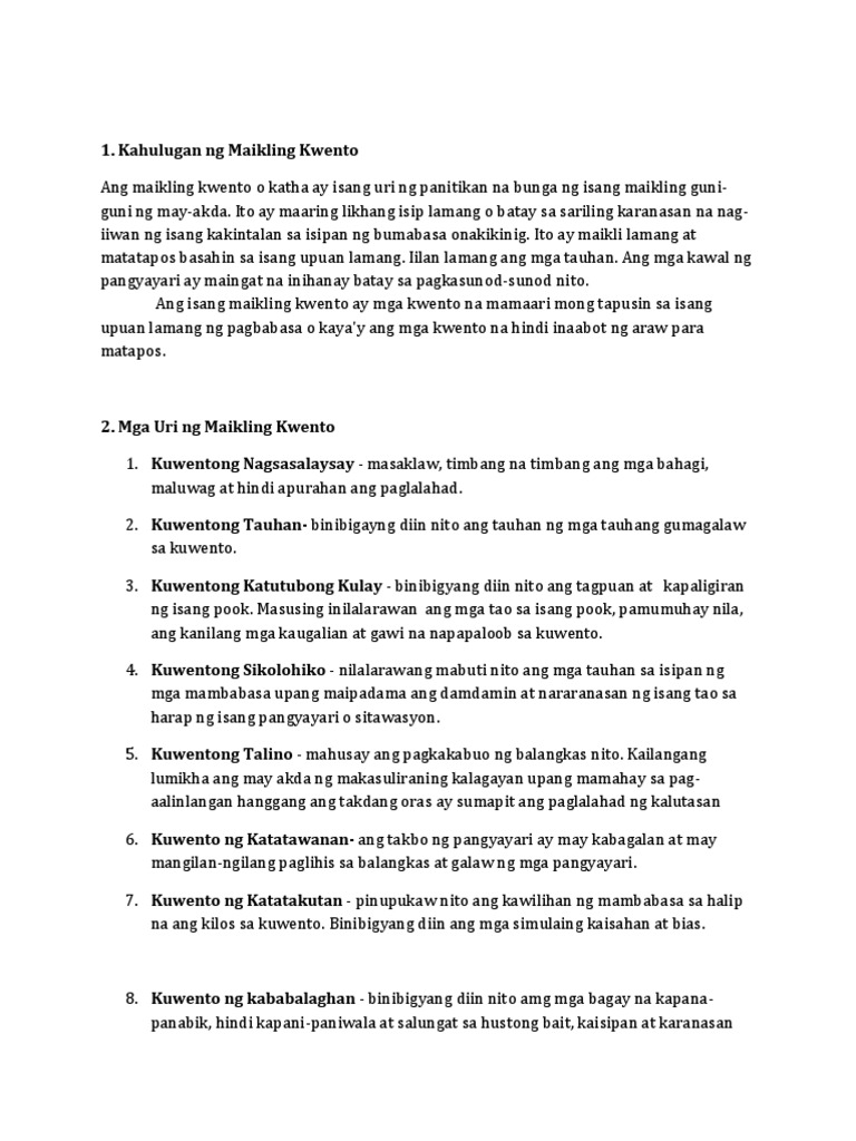 Panimula- Dito nakasalalay ang kawilihan ng. Ang mga pangyayari ay unti-unting bababa patungo sa wakas na. Ano ang maikling kuwento.