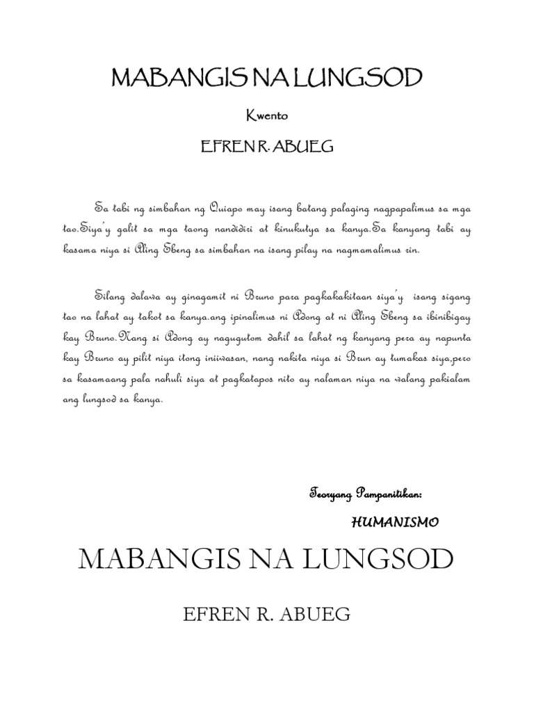Mabangis na lungsod maikling kwento ni efren r abueg. Abueg Sadyang may mga taong malupit at mapang-api. Ang gabi ay mabilis na lumatag sa mga gusali lumagom sa malalakit malil iit na lansangan dumantay sa mukha ng mga taong pagal sa mga taong araw-araw a y may bagong lunas na walang bias. Kung sino pa ang mahina at aba siya pang kinakaya-kaya.